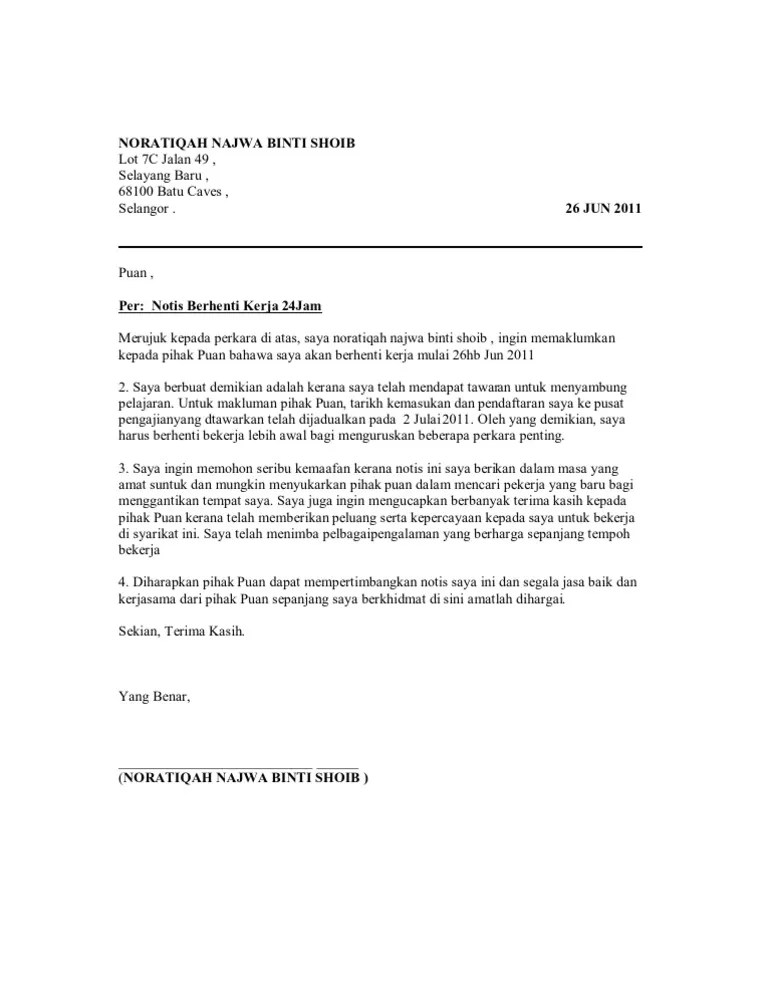 Contoh Surat Berhenti Kerja 24Jam / Contoh Surat Berhenti Kerja 24 Jam Download Kumpulan Contoh Surat Dan Soal Terlengkap - Semoga anda berjaya di tempat kerja yang baru dan jika anda bermula meniaga diharap semoga perniagaan anda akan berjaya satu masa kelak.. Terdapat pelbagai alasan dan sebab untuk seseorang berhenti kerja (leaving your job) antaranya adalah mendapat tawaran kerja yang lebih baik atau ingin menlanjutkan pelajaran ke peringkat lebih tinggi. Antaranya ialah format surat berhenti kerja 24 jam, berhenti serta merta dan yang paling biasa, dengan notis sebulan. 12, jalan 12/8 taman mutiara, 42000, shah alam, selangor, selangor darul ehsan _____ asia jaya sdn bhd, jalan ss15/1, ss15, 47100 subang jaya, selangor darul ehsan. Jika perlu, ambil cuti tanpa gaji sahaja. Ahmad idham no 112 jalan gemilang,